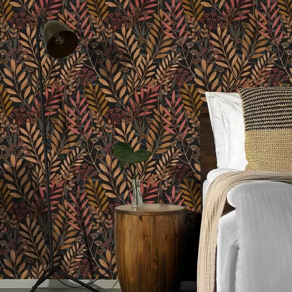 Tapetai Tamsus pievelė su stilizuotais lapais ir sėklų ankštimis Nr. a01020