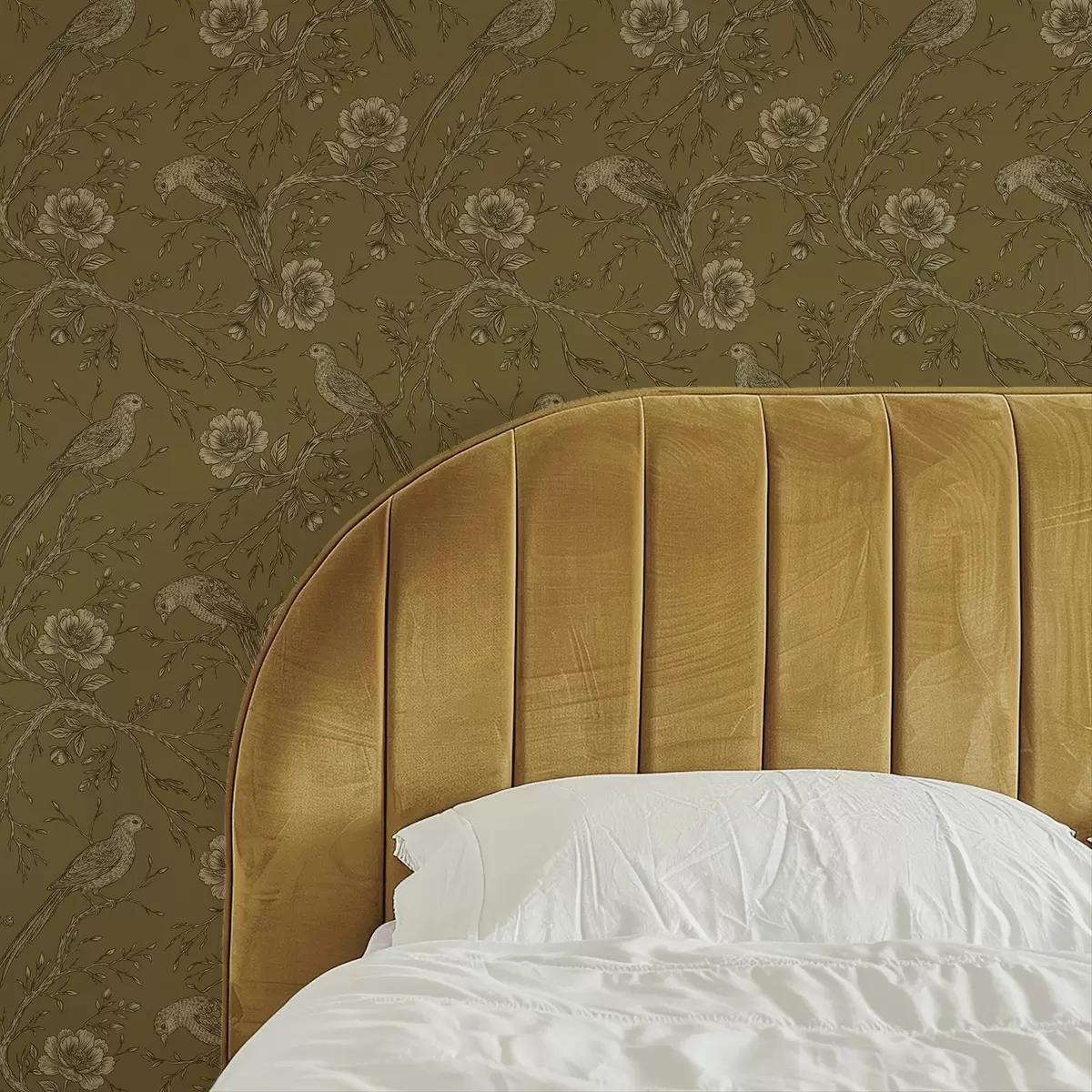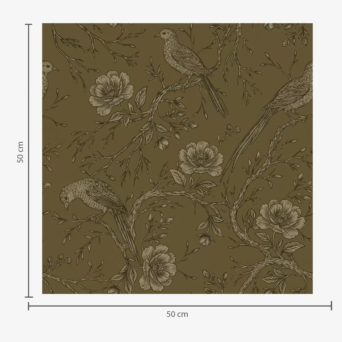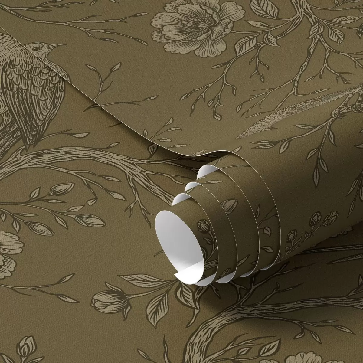 Tapetai Vintage paukščiai ir gėlės ant šilto alyvuogių fono Nr. a01022v1