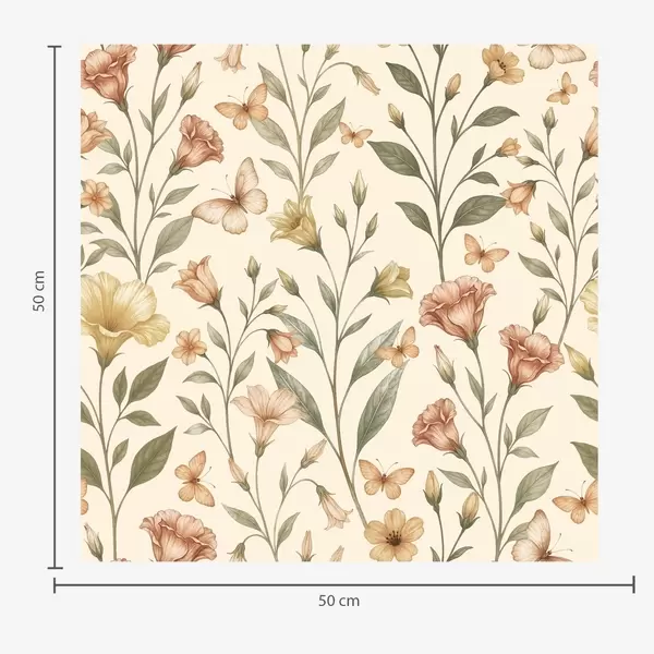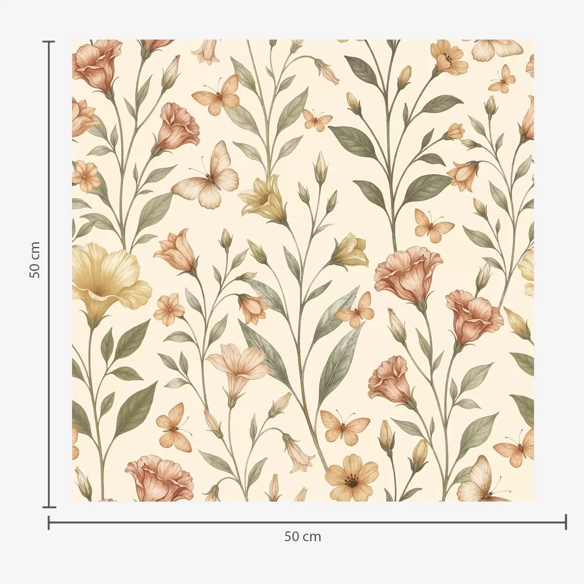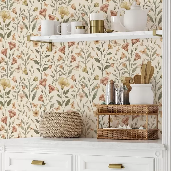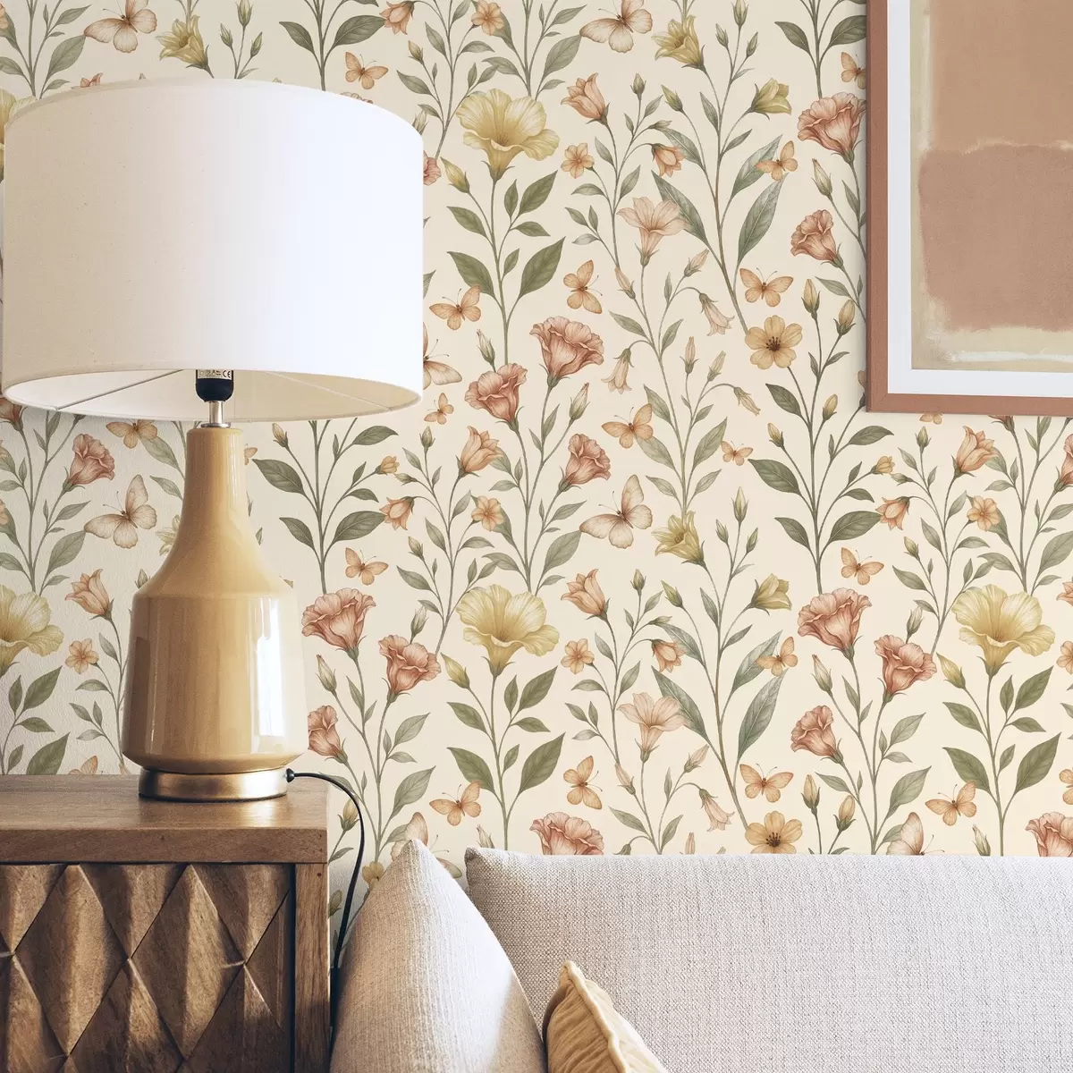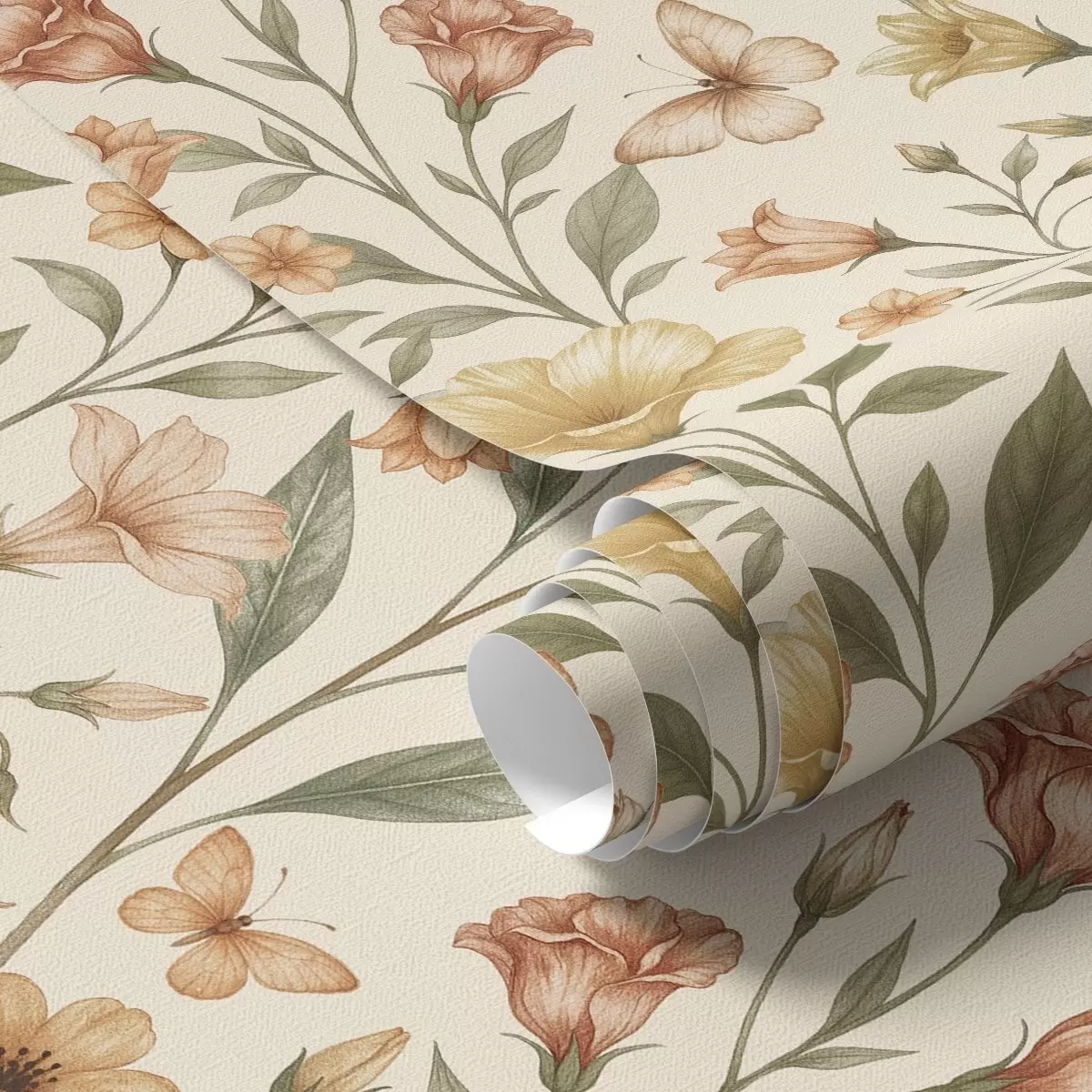 Tapetai Subtilūs persikų žiedai ir drugeliai ant šilto kreminio fono Nr. a01026