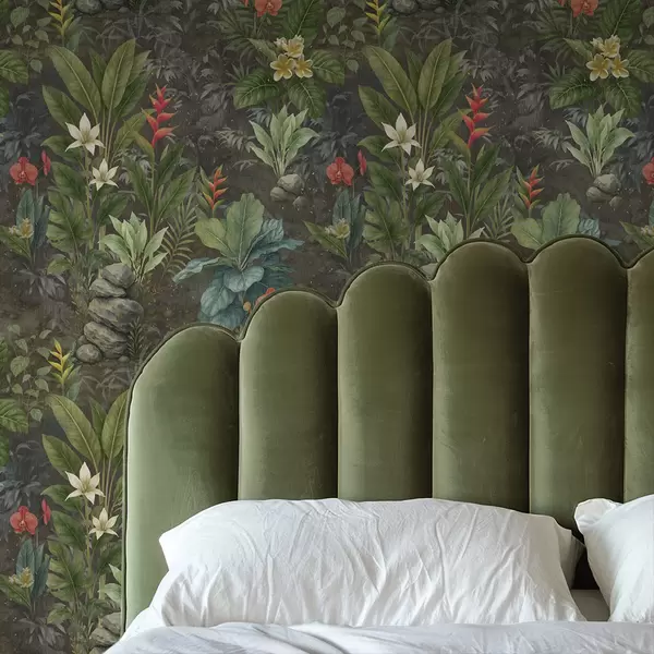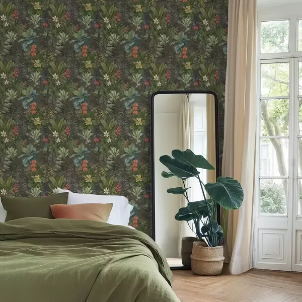Tapetai Tamsus tropinis sodas su ryškiais žiedais ir lapija Nr. a01079