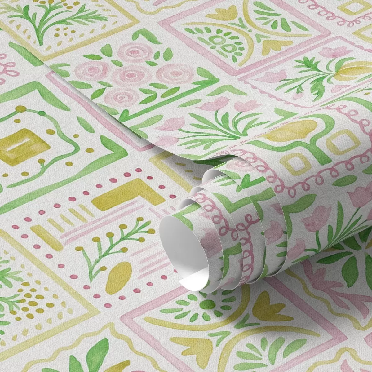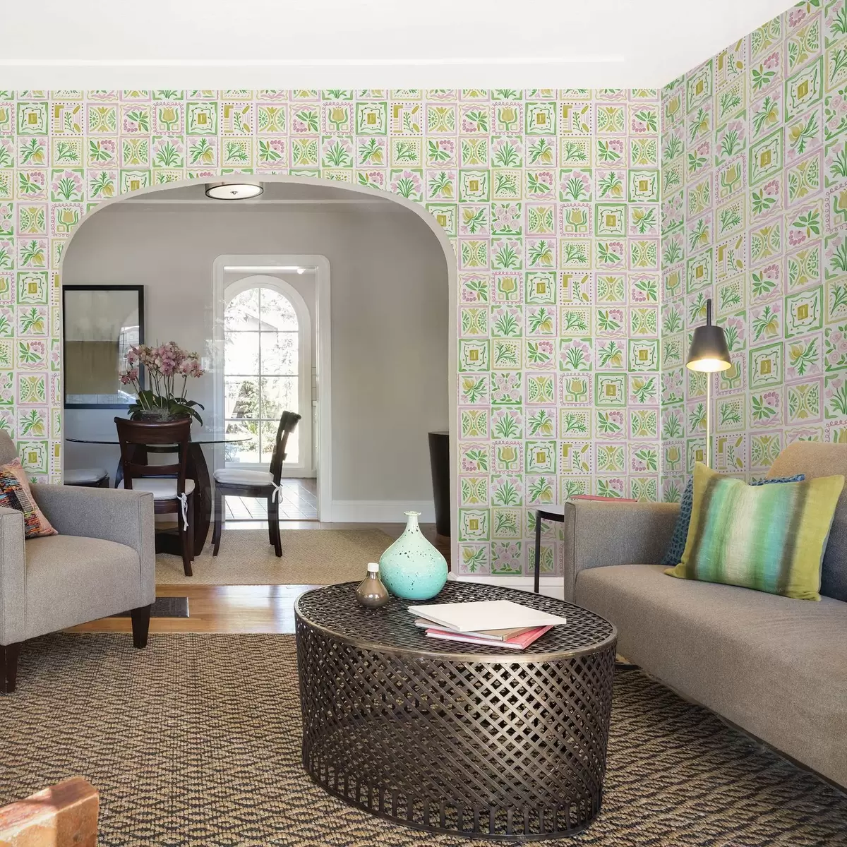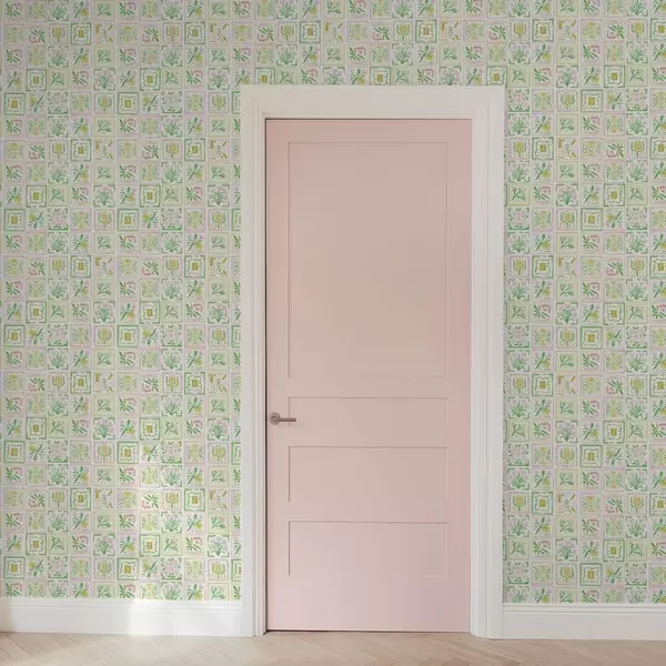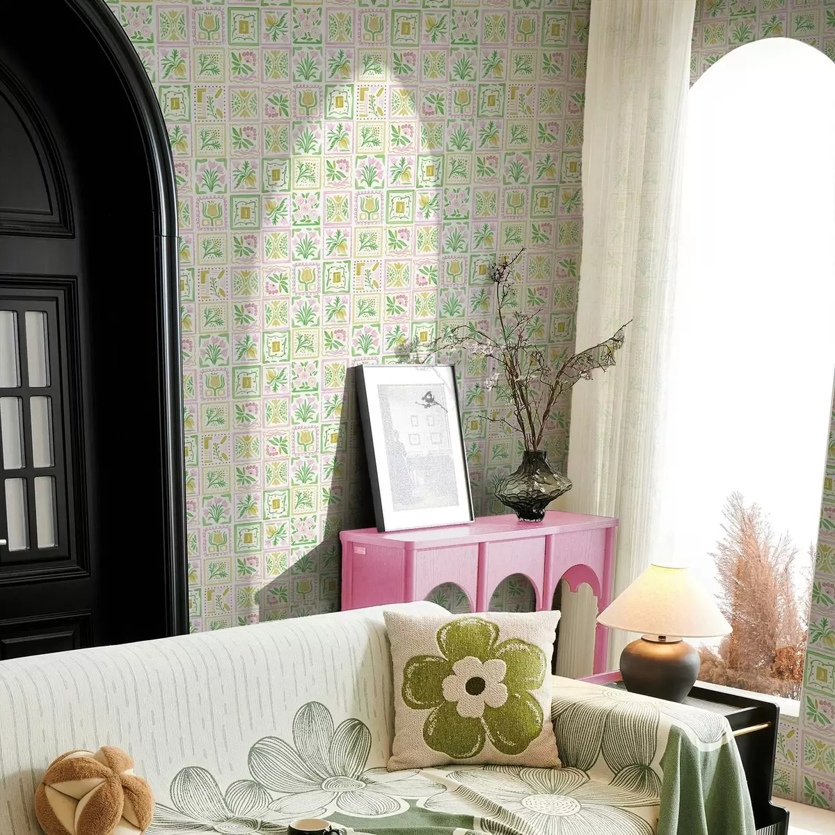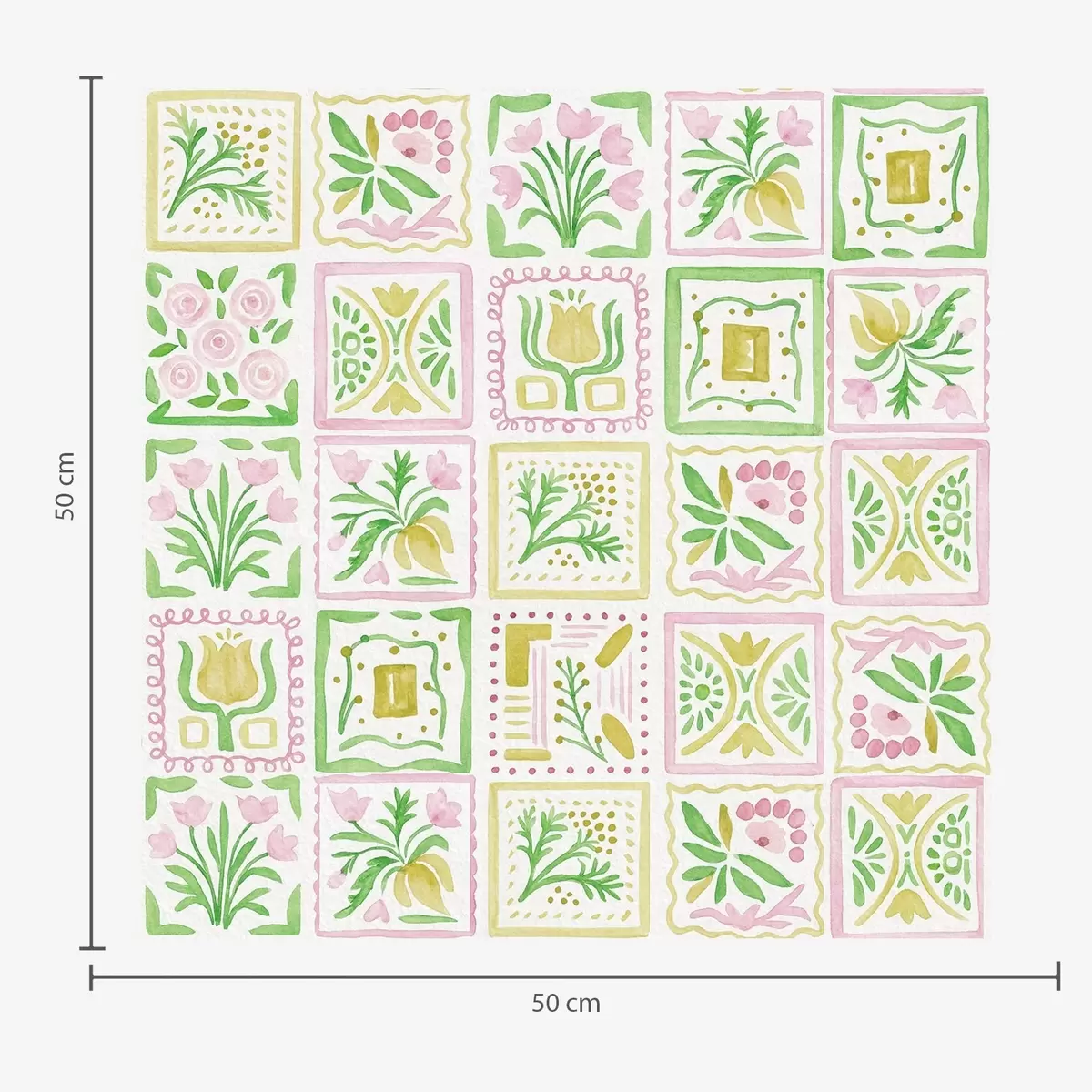 Tapetai Akrilo dažais tapyti kvadratai su rožiniais ir žaliais šakelių motyvais Nr. a01082