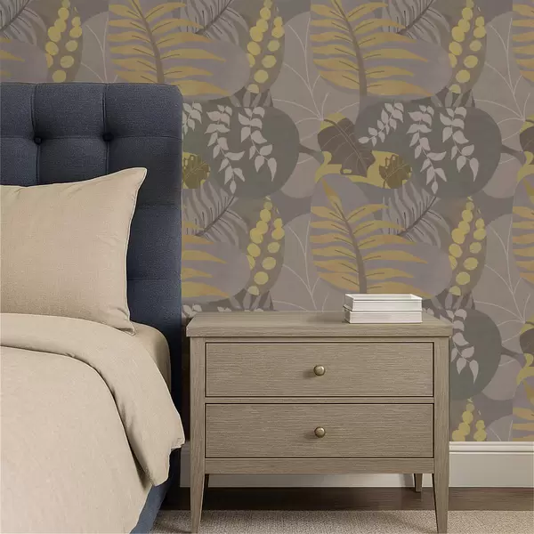 Tapetai Abstrakčios lapų kompozicijos pilkos ir geltonos spalvų tonais Nr. a01112