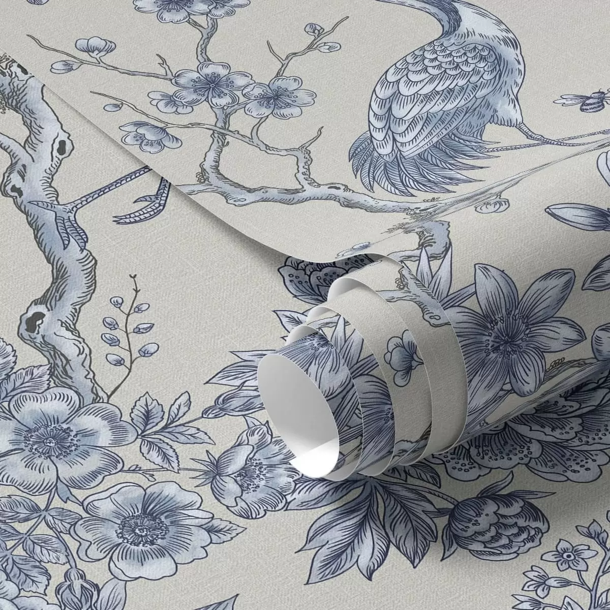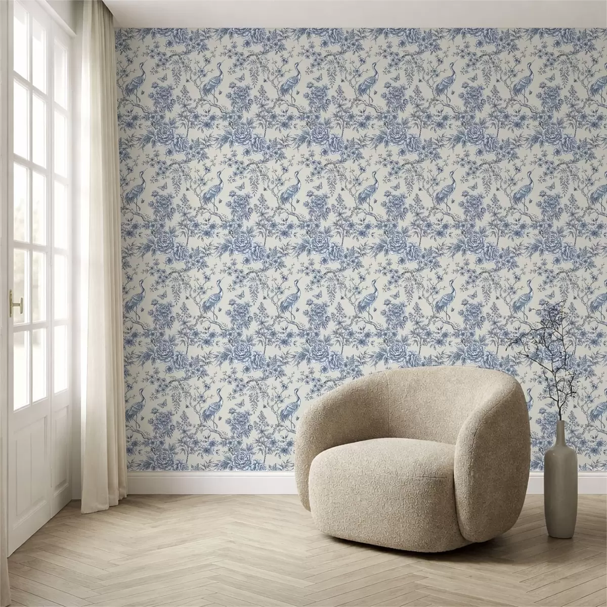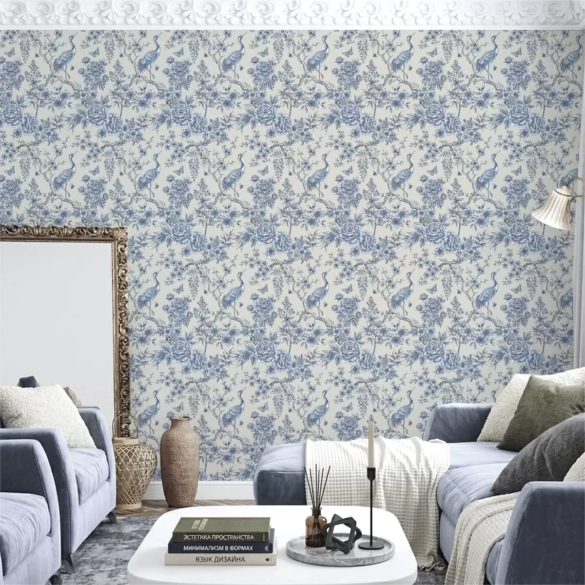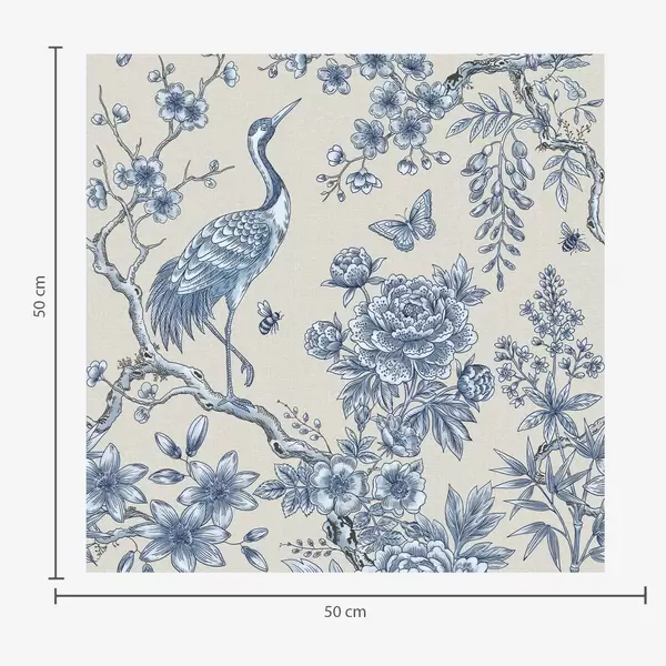 Tapetai Mėlynas gėlių ornamentas su paukščiu ir šakomis Nr. a01132