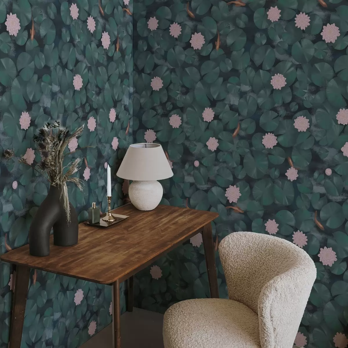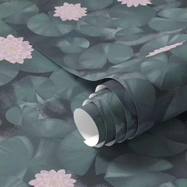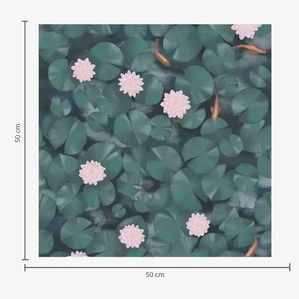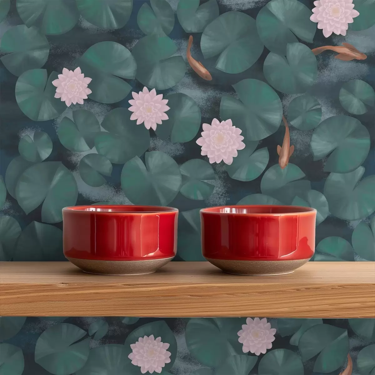 Tapetai Vandens lelijos su žiedais ir žuvimis ant tamsaus fono Nr. a01177