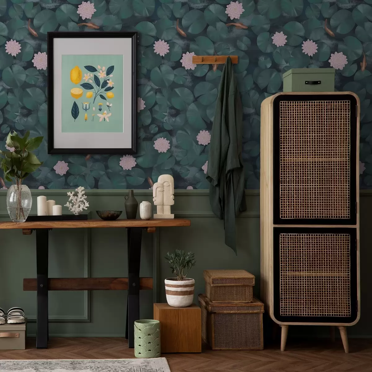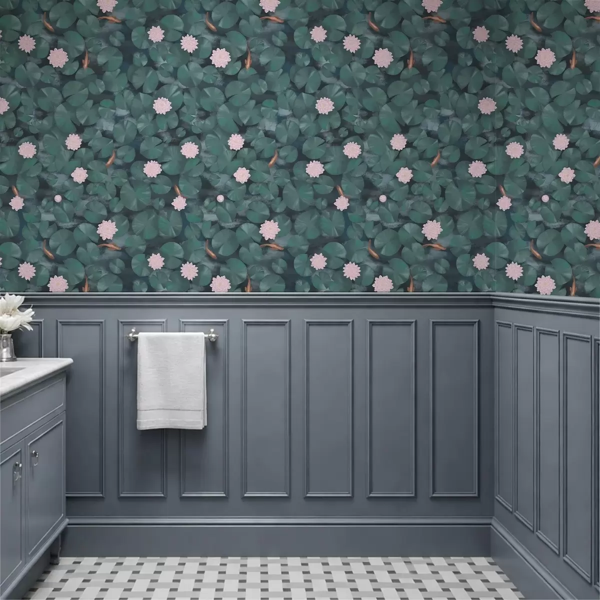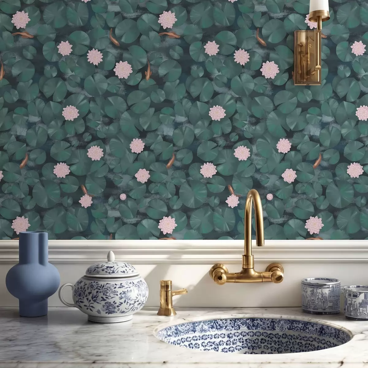 Tapetai Vandens lelijos su žiedais ir žuvimis ant tamsaus fono Nr. a01177