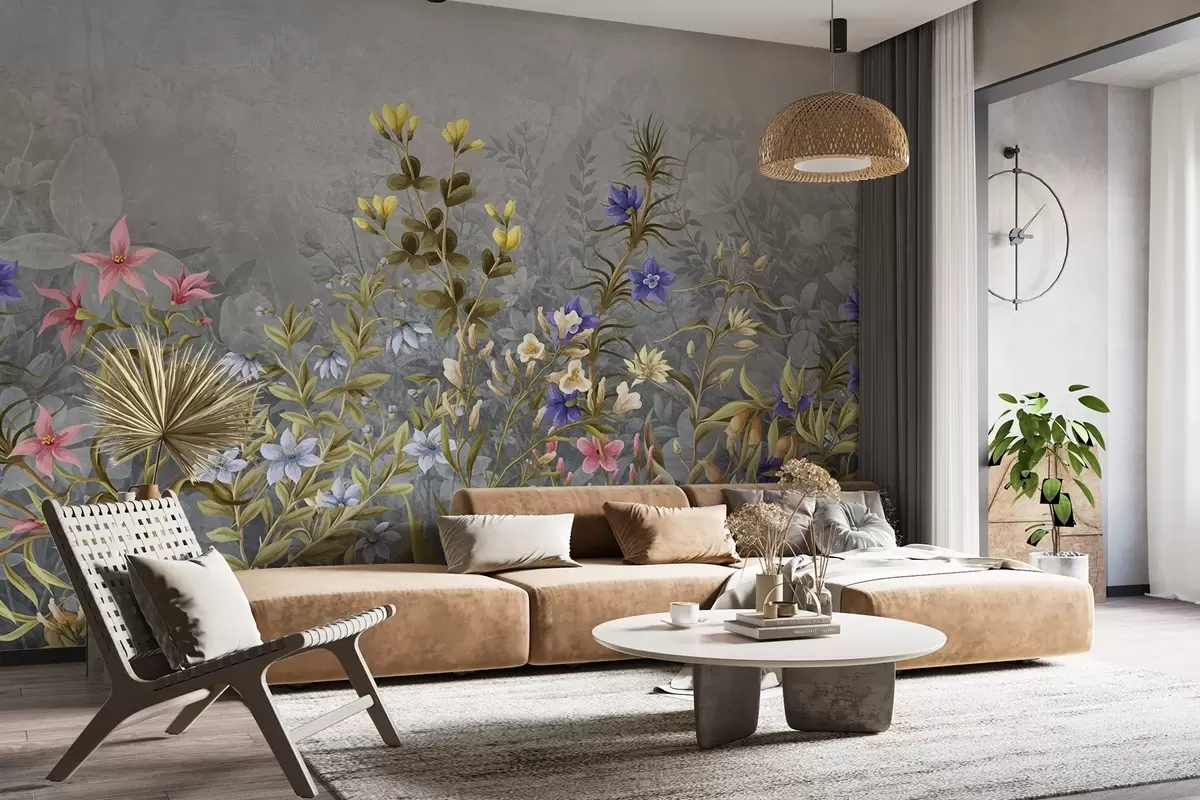Fototapetai Gausus, ryškus gėlių tekstūrinis raštas su spalvingomis gėlėmis ir augalais, pasižyminčiais sudėtingomis detalėmis ir tekstūromis Nr. w08428v1
